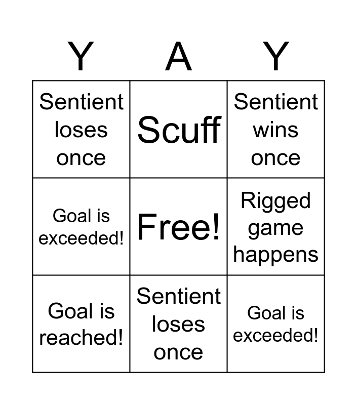 This bingo card has a free space and 11 words: Sentient cries, Sentient loses once, Goal is exceeded!, Goal is reached!, Scuff, Sentient wins once, Rigged game happens, Newbie wins a game, Goal is exceeded!, Sentient loses once and Scuff.