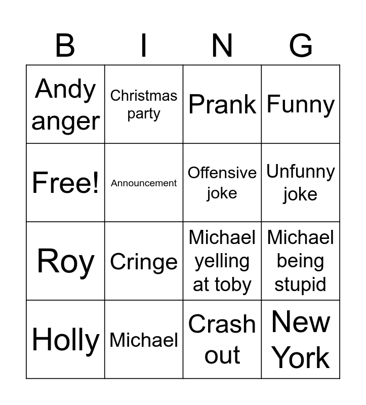 This bingo card has 16 words: Michael, Michael being stupid, Prank, Andy anger, Roy, Christmas party, Michael yelling at toby, Crash out, Free!, Announcement, Holly, Funny, Cringe, Unfunny joke, Offensive joke and New York.