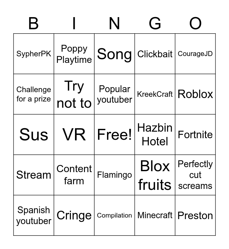 This bingo card has a free space and 24 words: Content farm, Cringe, Popular youtuber, Spanish youtuber, CourageJD, SypherPK, Challenge for a prize, Poppy Playtime, Hazbin Hotel, Flamingo, KreekCraft, Sus, Blox fruits, Perfectly cut screams, Try not to, Minecraft, Fortnite, Song, Roblox, VR, Preston, Stream, Clickbait and Compilation.