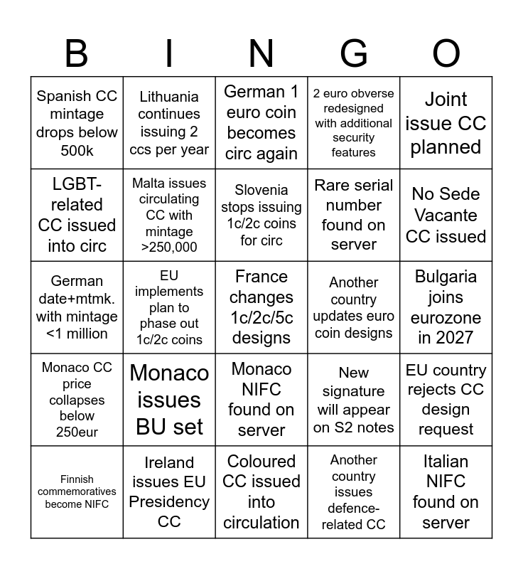 This bingo card has a free space and 24 words: Monaco issues BU set, Ireland issues EU Presidency CC, Slovenia stops issuing 1c/2c coins for circ, Finnish commemoratives become NIFC, Joint issue CC planned, Spanish CC mintage drops below 500k, LGBT-related CC issued into circ, Lithuania continues issuing 2 ccs per year, Another country updates euro coin designs, Monaco NIFC found on server, Rare serial number found on server, German date+mtmk. with mintage <1 million, New signature will appear on S2 notes, EU country rejects CC design request, Malta issues circulating CC with mintage >250,000, Another country issues defence-related CC, Bulgaria joins eurozone in 2027, German 1 euro coin becomes circ again, No Sede Vacante CC issued, EU implements plan to phase out 1c/2c coins, Italian NIFC found on server, Monaco CC price collapses below 250eur, 2 euro obverse redesigned with additional security features and Coloured CC issued into circulation.