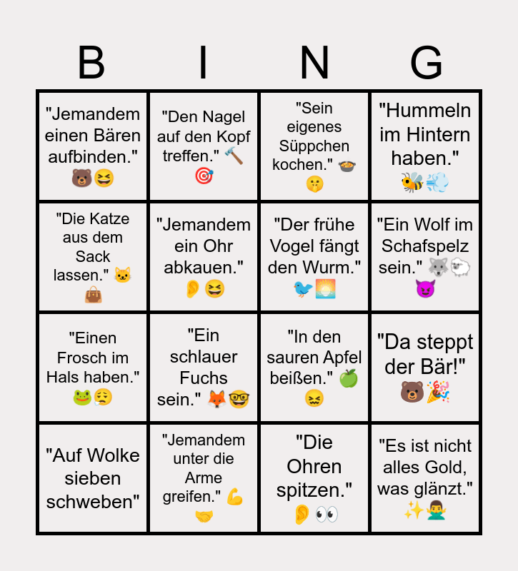 This bingo card has 22 words: "Jemandem unter die Arme greifen." 💪🤝, "Da lachen ja die Hühner!" 🐔😂, "Den Nagel auf den Kopf treffen." 🔨🎯, "Tomaten auf den Augen haben." 🍅👀, "Jemandem ein Ohr abkauen." 👂😆, "Der frühe Vogel fängt den Wurm." 🐦🌅, "Jemandem einen Bären aufbinden." 🐻😆, "Sein eigenes Süppchen kochen." 🍲🤫, "In den sauren Apfel beißen." 🍏😖, "Es ist nicht alles Gold, was glänzt." ✨🙅♂️, "Einen Frosch im Hals haben." 🐸😮💨, "Hummeln im Hintern haben." 🐝💨, "Die Hände in den Schoß legen." 👐😴, "Seine Nase in alles stecken." 👃🤨, "Die Ohren spitzen." 👂👀, "Eine Extrawurst bekommen." 🌭🐷, "Da steppt der Bär!" 🐻🎉, "Auf Wolke sieben schweben", "Ein schlauer Fuchs sein." 🦊🤓, "Die Katze aus dem Sack lassen." 🐱👜, "Ein Wolf im Schafspelz sein." 🐺🐑😈 and "Etwas aus dem Ärmel schütteln." 🏃♂️🎩.