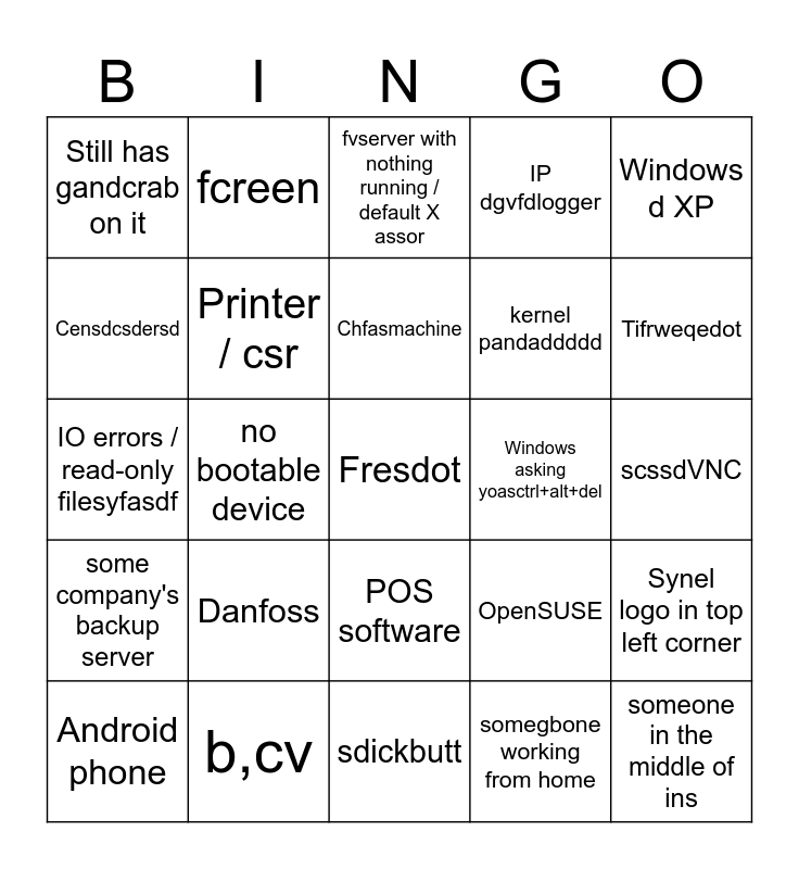 This bingo card has a free space and 24 words: Danfoss, b,cv, Chfasmachine, Android phone, Windows d XP, Still has gandcrab on it, Censdcsdersd, fcreen, Windows asking yoasctrl+alt+del, POS software, kernel pandaddddd, IO errors / read-only filesyfasdf, OpenSUSE, Synel logo in top left corner, Printer / csr, somegbone working from home, scssdVNC, fvserver with nothing running / default X assor, Tifrweqedot, no bootable device, someone in the middle of ins, some company's backup server, IP dgvfdlogger and sdickbutt.