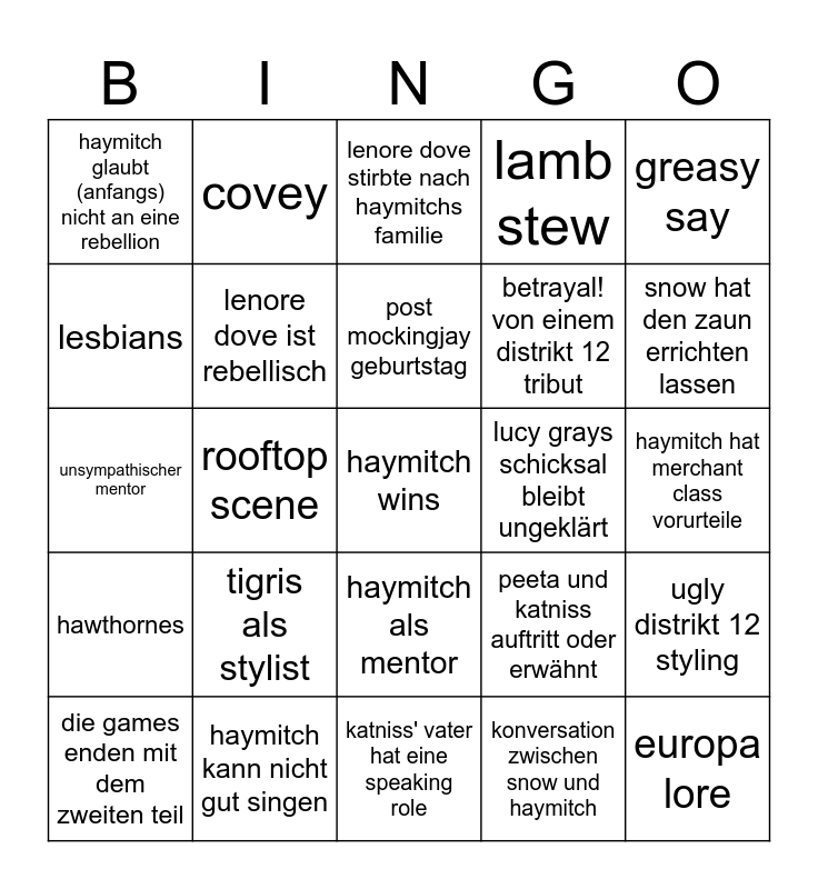 This bingo card has a free space and 24 words: tigris als stylist, haymitch kann nicht gut singen, post mockingjay geburtstag, die games enden mit dem zweiten teil, greasy say, haymitch glaubt (anfangs) nicht an eine rebellion, lesbians, covey, lucy grays schicksal bleibt ungeklärt, haymitch als mentor, betrayal! von einem distrikt 12 tribut, unsympathischer mentor, peeta und katniss auftritt oder erwähnt, ugly distrikt 12 styling, lenore dove ist rebellisch, konversation zwischen snow und haymitch, haymitch hat merchant class vorurteile, lenore dove stirbte nach haymitchs familie, snow hat den zaun errichten lassen, rooftop scene, europa lore, hawthornes, lamb stew and katniss' vater hat eine speaking role.