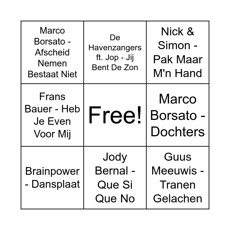 This bingo card has a free space and 14 words: Andre Hazes - Zij Gelooft In Mij, Basshunter - Boten Anna, Brainpower - Dansplaat, De Havenzangers ft. Jop - Jij Bent De Zon, Frans Bauer - Heb Je Even Voor Mij, Guus Meeuwis - Tranen Gelachen, Jan Smit - Als De Morgen Is Gekomen, Jan Smit - Laura, Jody Bernal - Que Si Que No, Marco Borsato - Afscheid Nemen Bestaat Niet, Marco Borsato - Binnen, Marco Borsato - Dochters, Nick & Simon - Pak Maar M'n Hand and Wolter Kroes - Viva Hollandia.