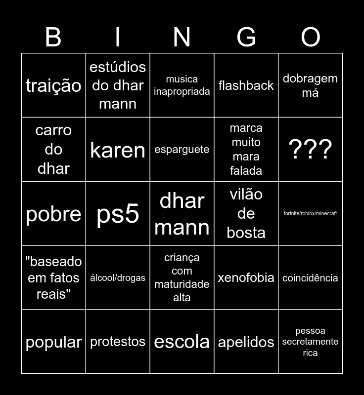 This bingo card has a free space and 37 words: sabe..., criança e um ipad, mimado, karen, coincidência, álcool/drogas, esparguete, merch aleatória, dobragem má, time skip, ps5, flashback, pessoa secretamente rica, fortnite/roblox/minecraft, carro do dhar, "baseado em fatos reais", random confronto no estacionamento, musica inapropriada, criança com maturidade alta, vilão de bosta, traição, ???, popular, escola, falar sozinho, apelidos, estúdios do dhar mann, "está demitido", youtuber random, lição de moral, bully, protestos, pobre, desumilde, xenofobia, marca muito mara falada and gordofóbico.