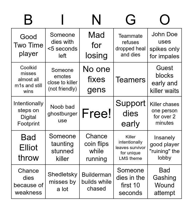 This bingo card has a free space and 59 words: Roblox avatar is forsaken related, Shedletsky misses by a lot, Death to terrible hitbox, Bad Elliot throw, Someone dies in the first 10 seconds, <1 hour playtime player, Someone emotes close to killer (not friendly), Friendly killer, Teamers, Exploiter, Teammate refuses dropped heal and dies, Bad Guest player, Coolkid misses almost all m1s and still wins, Runs into obvious Digital Footprint, Bad looking "Yourself" skin, Good Two Time player, Bad Gashing Wound attempt, John Doe uses spikes only for impales, Complaining about game balance, No one fixes gens, Support dies early, Mad for losing, Chance dies because of weakness, Insanely good player "ruining" the lobby, Killer resets/leaves, Almost full lobby but <5 people in game, AFK without AFK mode, Bad dispenser placement, Guest blocks early and killer waits, Server dies, Group of people doing emotes, Good player makes a dumb play, 7n7 obvious clone use, Teammate refuses to help, Someone dies with <5 seconds left, Bad killer with >3 days playtime, Several people try to stun killer at the same time, Noob bad ghostburger use, Guest pushes the killer closer, Intentionally steps on Digital Footprint, Killer drops chase on a low health target for no reason, Someone taunting stunned killer, Killer chases one person for over 2 minutes, Support character focusing generators, Someone takes a lot of damage for fixing a generator, Pointless Guest charge, 5+ Sentinels, Two Time thinks they're invincible, Chance coin flips while running, Builderman builds while chased, Dusekkar instant shield break, 1x misses most shots and still wins, 1x tries to use Entanglement + Mass Infection combo too often, 3+ Elliots, Rarely used killer skin, Killer intentionally leaves survivor for unique LMS theme, Player with >40K points, Someone gets hit by a projectile intended for someone else and Shedletsky gets hit right after healing.