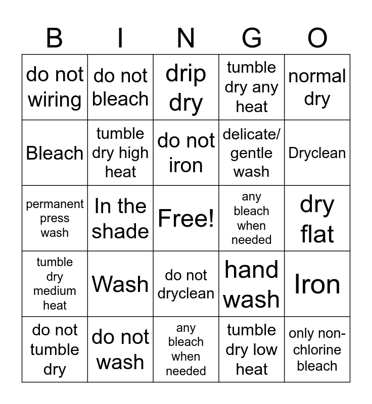This bingo card has a free space and 24 words: Wash, do not wash, do not iron, do not tumble dry, normal dry, do not wiring, Bleach, do not bleach, any bleach when needed, do not dryclean, delicate/ gentle wash, permanent press wash, hand wash, Iron, tumble dry high heat, tumble dry low heat, dry flat, drip dry, Dryclean, In the shade, only non-chlorine bleach, tumble dry medium heat, tumble dry any heat and any bleach when needed.
