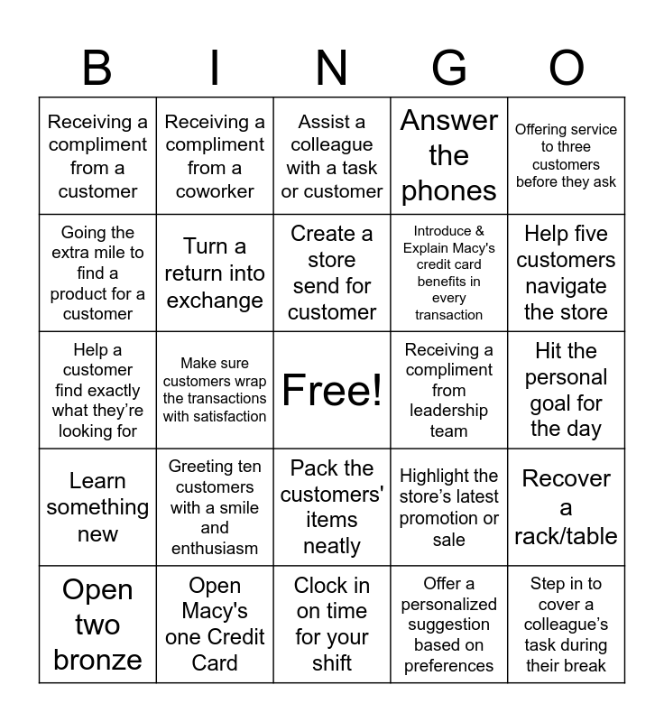 This bingo card has a free space and 24 words: Greeting ten customers with a smile and enthusiasm, Open Macy's one Credit Card, Create a store send for customer, Open two bronze, Offering service to three customers before they ask, Receiving a compliment from a customer, Going the extra mile to find a product for a customer, Receiving a compliment from a coworker, Receiving a compliment from leadership team, Pack the customers' items neatly, Introduce & Explain Macy's credit card benefits in every transaction, Help a customer find exactly what they’re looking for, Highlight the store’s latest promotion or sale, Recover a rack/table, Turn a return into exchange, Offer a personalized suggestion based on preferences, Hit the personal goal for the day, Assist a colleague with a task or customer, Help five customers navigate the store, Make sure customers wrap the transactions with satisfaction, Step in to cover a colleague’s task during their break, Learn something new, Answer the phones and Clock in on time for your shift.
