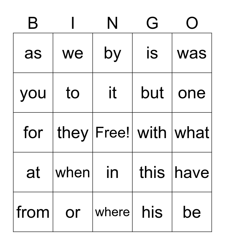 This bingo card has a free space and 35 words: the, of, and, to, in, is, you, that, it, he, for, was, on, are, as, with, his, they, at, be, this, from, have, or, by, one, had, not, but, what, all, where, when, we and there.