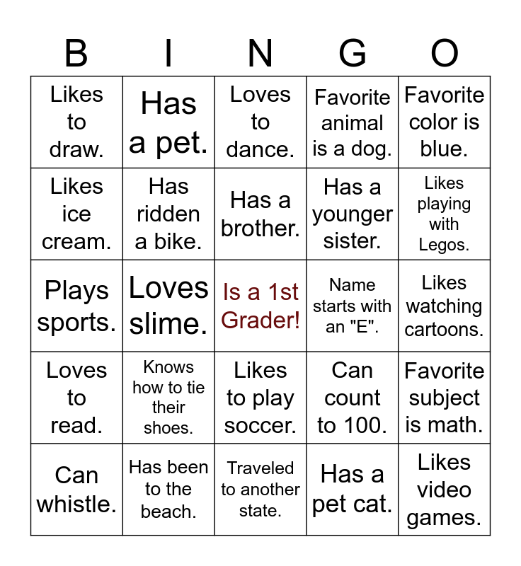 This bingo card has a free space and 24 words: Knows how to tie their shoes., Has been to the beach., Has a brother., Can whistle., Favorite color is blue., Likes to draw., Likes ice cream., Has a pet., Name starts with an "E"., Likes to play soccer., Has a younger sister., Plays sports., Can count to 100., Favorite subject is math., Has ridden a bike., Has a pet cat., Likes watching cartoons., Loves to dance., Likes playing with Legos., Loves slime., Likes video games., Loves to read., Favorite animal is a dog. and Traveled to another state..