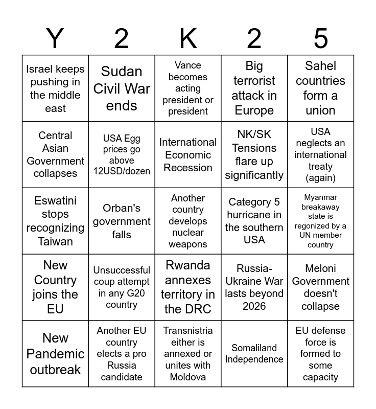 This bingo card has 25 words: Unsuccessful coup attempt in any G20 country, Transnistria either is annexed or unites with Moldova, International Economic Recession, New Pandemic outbreak, Sahel countries form a union, Israel keeps pushing in the middle east, Central Asian Government collapses, Sudan Civil War ends, Category 5 hurricane in the southern USA, Rwanda annexes territory in the DRC, NK/SK Tensions flare up significantly, Eswatini stops recognizing Taiwan, Russia-Ukraine War lasts beyond 2026, Meloni Government doesn't collapse, USA Egg prices go above 12USD/dozen, EU defense force is formed to some capacity, Myanmar breakaway state is regonized by a UN member country, Vance becomes acting president or president, USA neglects an international treaty (again), Orban's government falls, Another country develops nuclear weapons, Another EU country elects a pro Russia candidate, New Country joins the EU, Big terrorist attack in Europe and Somaliland Independence.