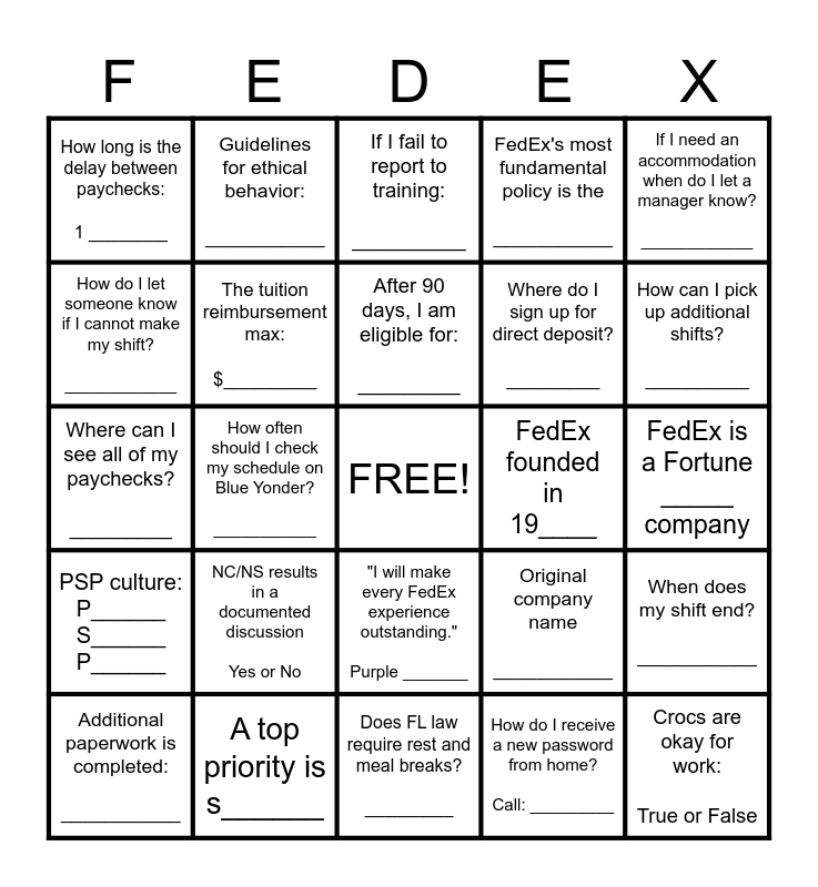 This bingo card has a free space and 24 words: Additional paperwork is completed: ___________, NC/NS results in a documented discussion Yes or No, After 90 days, I am eligible for: _________, How do I receive a new password from home? Call: _________, If I need an accommodation when do I let a manager know? ____________, How long is the delay between paychecks: 1 ________, Guidelines for ethical behavior: ___________, If I fail to report to training: __________, FedEx founded in 19____, FedEx is a Fortune _____ company, Where can I see all of my paychecks? _________, The tuition reimbursement max: $_________, Original company name ___________, When does my shift end? ___________, How do I let someone know if I cannot make my shift? ____________, A top priority is s______, Does FL law require rest and meal breaks? _________, FedEx's most fundamental policy is the ___________, How can I pick up additional shifts? __________, PSP culture: P______ S______ P______, How often should I check my schedule on Blue Yonder? ___________, "I will make every FedEx experience outstanding." Purple _______, Where do I sign up for direct deposit? _________ and Crocs are okay for work: True or False.