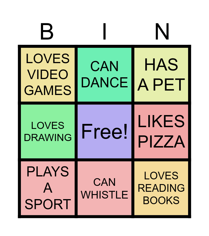 This bingo card has a free space and 8 words: LIKES PIZZA, HAS A PET, CAN DANCE, PLAYS A SPORT, LOVES VIDEO GAMES, LOVES READING BOOKS, LOVES DRAWING and CAN WHISTLE.