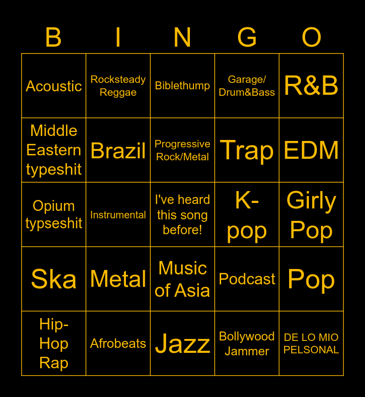 This bingo card has a free space and 27 words: Podcast, Ad, Trap, Jazz, Middle Eastern typeshit, Biblethump, Rocksteady Reggae, Ska, K-pop, Pop, Opium typseshit, Garage/ Drum&Bass, Hip-Hop Rap, Afrobeats, EDM, Dubstep, Brazil, Progressive Rock/Metal, Metal, Acoustic, Girly Pop, Bollywood Jammer, Instrumental, DE LO MIO PELSONAL, Music of Asia, R&B and Classical.