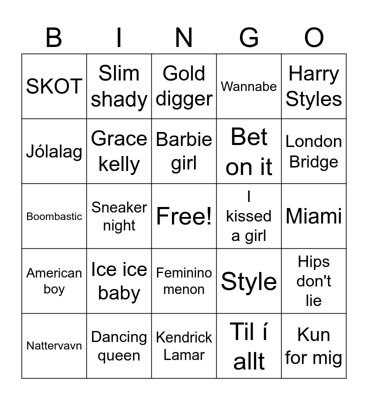 This bingo card has a free space and 24 words: Ice ice baby, Dancing queen, Barbie girl, Nattervavn, Harry Styles, SKOT, Jólalag, Slim shady, I kissed a girl, Feminino menon, Bet on it, Boombastic, Style, Hips don't lie, Grace kelly, Til í allt, Miami, Gold digger, London Bridge, Sneaker night, Kun for mig, American boy, Wannabe and Kendrick Lamar.