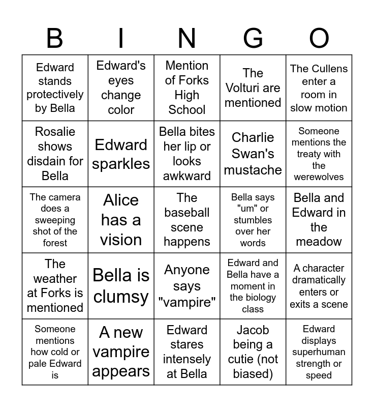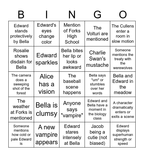 This bingo card has 25 words: Bella is clumsy, Edward stares intensely at Bella, Bella bites her lip or looks awkward, Someone mentions how cold or pale Edward is, The Cullens enter a room in slow motion, Edward stands protectively by Bella, Rosalie shows disdain for Bella, Edward's eyes change color, Bella says "um" or stumbles over her words, Anyone says "vampire", Charlie Swan's mustache, The camera does a sweeping shot of the forest, Edward and Bella have a moment in the biology class, A character dramatically enters or exits a scene, Edward sparkles, Edward displays superhuman strength or speed, Bella and Edward in the meadow, Mention of Forks High School, Someone mentions the treaty with the werewolves, Alice has a vision, The baseball scene happens, A new vampire appears, The weather at Forks is mentioned, The Volturi are mentioned and Jacob being a cutie (not biased).