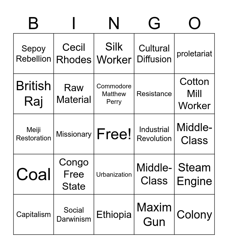 This bingo card has a free space and 24 words: Congo Free State, Social Darwinism, Commodore Matthew Perry, Capitalism, proletariat, Sepoy Rebellion, British Raj, Cecil Rhodes, Industrial Revolution, Urbanization, Resistance, Meiji Restoration, Middle-Class, Steam Engine, Raw Material, Maxim Gun, Middle-Class, Silk Worker, Cotton Mill Worker, Missionary, Colony, Coal, Cultural Diffusion and Ethiopia.