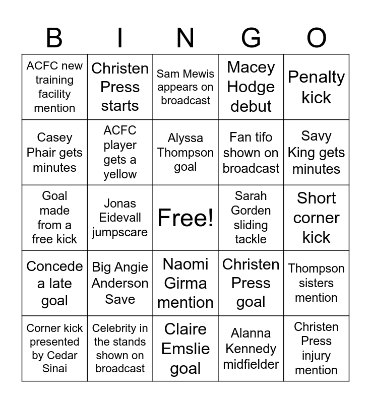 This bingo card has a free space and 24 words: Big Angie Anderson Save, Celebrity in the stands shown on broadcast, Alyssa Thompson goal, Corner kick presented by Cedar Sinai, Penalty kick, ACFC new training facility mention, Casey Phair gets minutes, Christen Press starts, Sarah Gorden sliding tackle, Naomi Girma mention, Fan tifo shown on broadcast, Goal made from a free kick, Christen Press goal, Thompson sisters mention, ACFC player gets a yellow, Alanna Kennedy midfielder, Short corner kick, Sam Mewis appears on broadcast, Savy King gets minutes, Jonas Eidevall jumpscare, Christen Press injury mention, Concede a late goal, Macey Hodge debut and Claire Emslie goal.