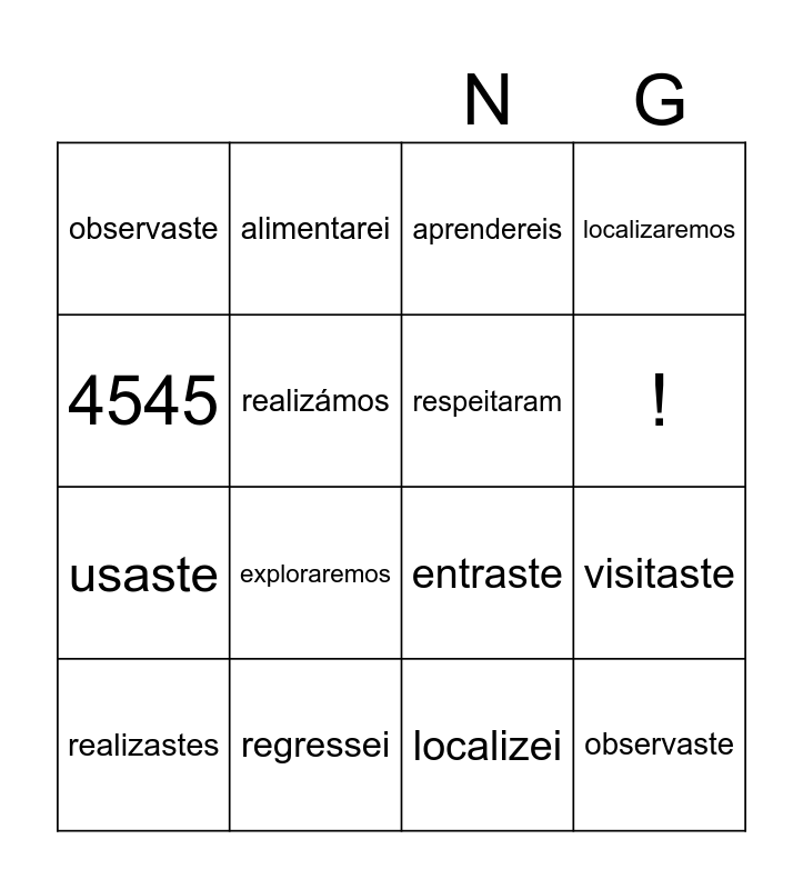 This bingo card has 23 words: observaste, FSDF, !, SDFSD, 4545, observaste, realizámos, alimentarei, realizastes, conheceriamos, exploraremos, usaste, regressaremos, voaram, regressei, explorámos, aprendereis, entraste, respeitaram, visitaste, localizaremos, localizei and aprendi.