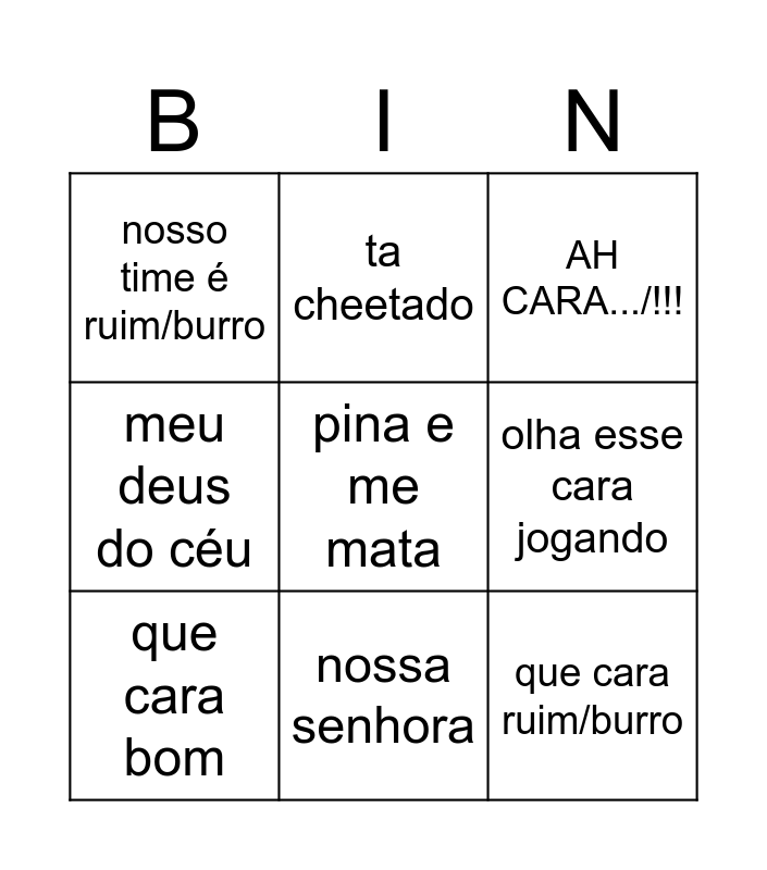 This bingo card has 12 words: ele ta cheetado?, que cara ruim/burro, pina e me mata, olha esse cara jogando, ta cheetado, AH CARA.../!!!, nossa senhora, me cagou, nosso time é ruim/burro, meu deus do céu, que cara bom and AHHHHH.