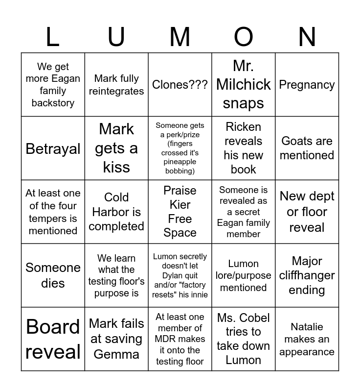 This bingo card has a free space and 24 words: We learn what the testing floor's purpose is, Mark fails at saving Gemma, Someone gets a perk/prize (fingers crossed it's pineapple bobbing), Board reveal, Pregnancy, We get more Eagan family backstory, Betrayal, Mark fully reintegrates, Someone is revealed as a secret Eagan family member, Lumon secretly doesn't let Dylan quit and/or "factory resets" his innie, Ricken reveals his new book, At least one of the four tempers is mentioned, Lumon lore/purpose mentioned, Major cliffhanger ending, Mark gets a kiss, Ms. Cobel tries to take down Lumon, New dept or floor reveal, Clones???, Goats are mentioned, Cold Harbor is completed, Natalie makes an appearance, Someone dies, Mr. Milchick snaps and At least one member of MDR makes it onto the testing floor.