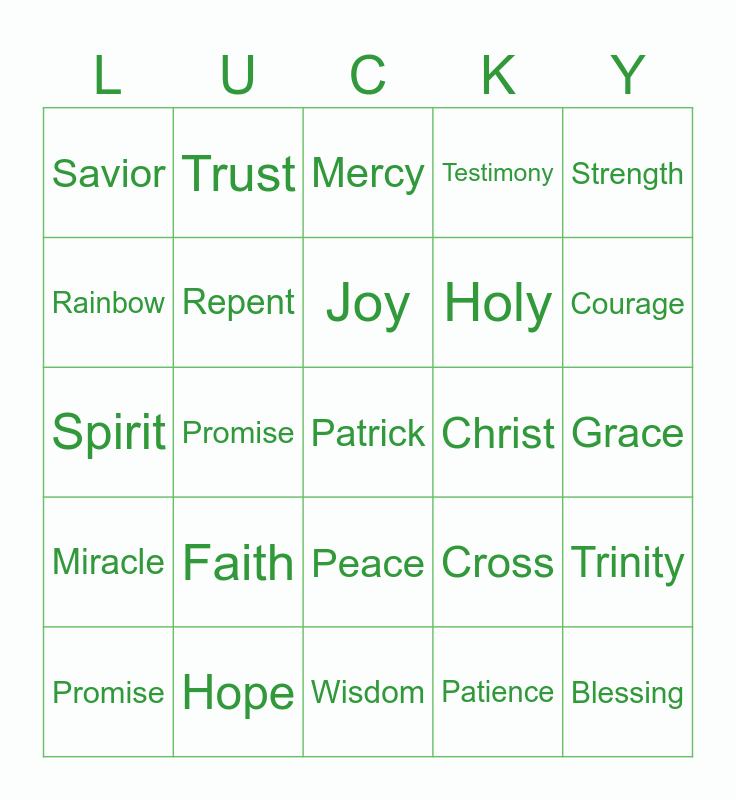 This bingo card has a free space and 24 words: Faith, Hope, Joy, Promise, Strength, Savior, Rainbow, Trust, Christ, Peace, Holy, Spirit, Cross, Trinity, Repent, Patience, Grace, Mercy, Courage, Promise, Blessing, Miracle, Testimony and Wisdom.