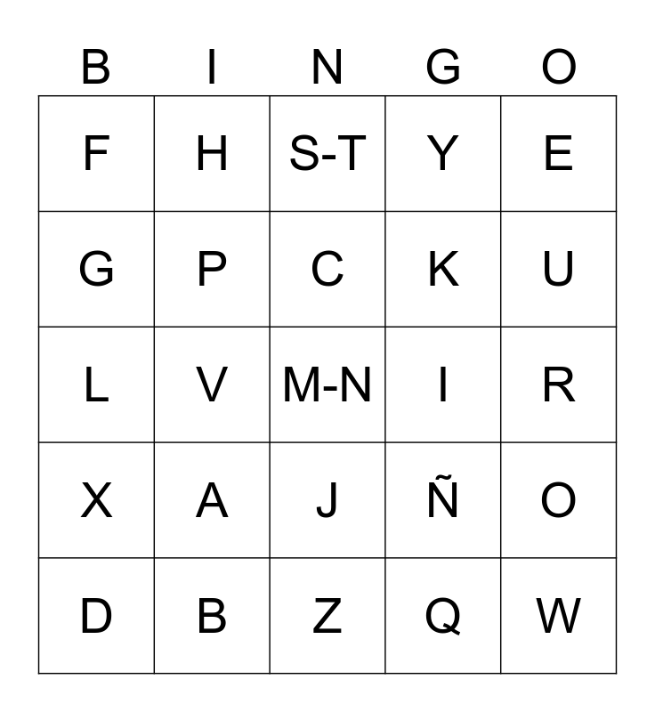 This bingo card has a free space and 24 words: A, B, C, D, E, F, G, H, I, J, K, L, Ñ, O, P, Q, R, S-T, U, V, W, X, Y and Z.
