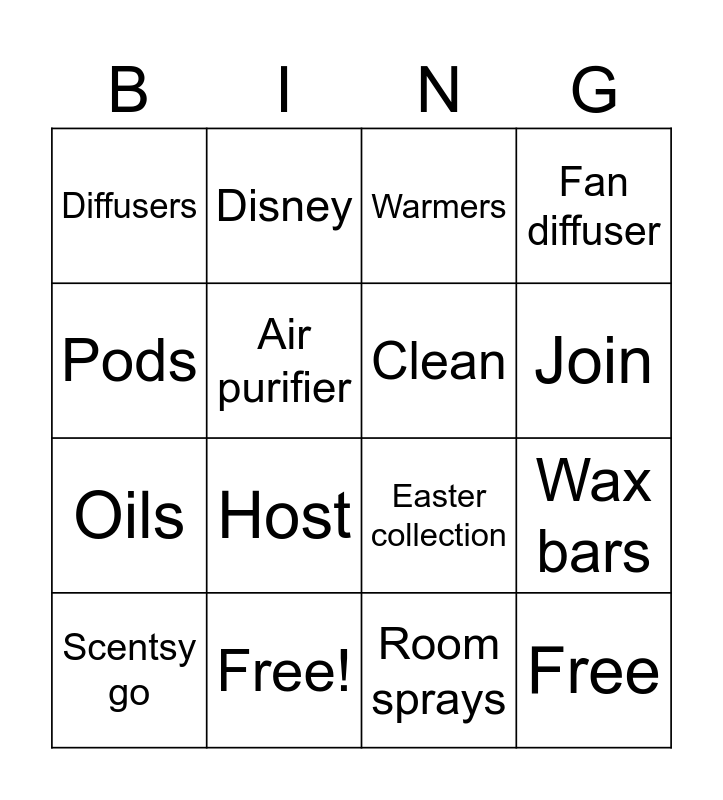 This bingo card has 16 words: Free!, Wax bars, Warmers, Diffusers, Oils, Disney, Easter collection, Room sprays, Pods, Air purifier, Scentsy go, Fan diffuser, Host, Join, Clean and Free.