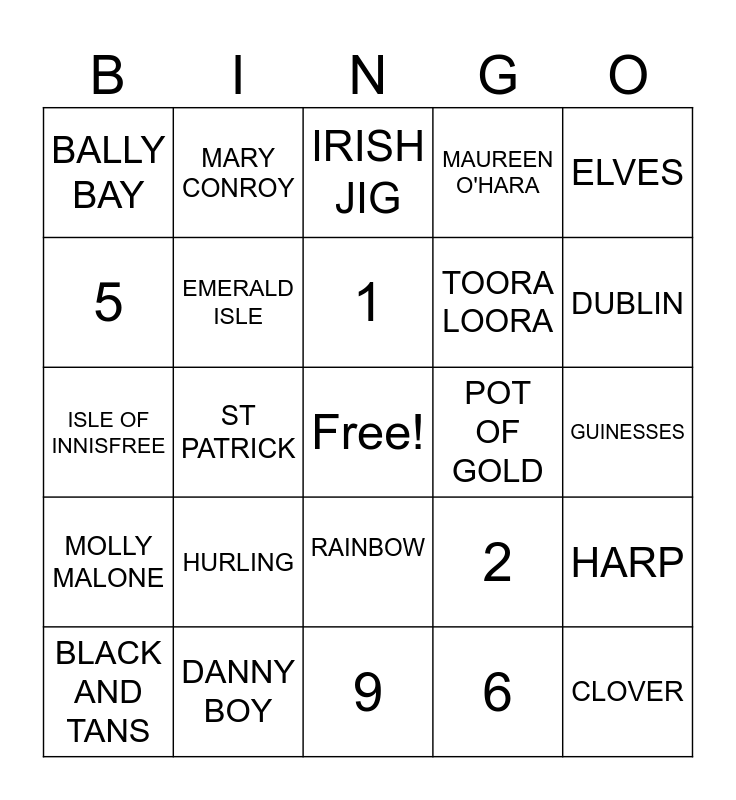 This bingo card has a free space and 24 words: HURLING, DANNY BOY, 1, BLACK AND TANS, ELVES, BALLY BAY, 5, MARY CONROY, POT OF GOLD, RAINBOW, TOORA LOORA, ISLE OF INNISFREE, 2, HARP, EMERALD ISLE, 6, GUINESSES, IRISH JIG, DUBLIN, ST PATRICK, CLOVER, MOLLY MALONE, MAUREEN O'HARA and 9.