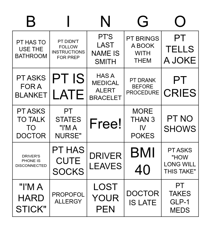 This bingo card has a free space and 24 words: PT HAS CUTE SOCKS, PROPOFOL ALLERGY, HAS A MEDICAL ALERT BRACELET, "I'M A HARD STICK", PT TELLS A JOKE, PT HAS TO USE THE BATHROOM, PT ASKS FOR A BLANKET, PT DIDN'T FOLLOW INSTRUCTIONS FOR PREP, MORE THAN 3 IV POKES, DRIVER LEAVES, PT DRANK BEFORE PROCEDURE, PT ASKS TO TALK TO DOCTOR, BMI 40, PT ASKS "HOW LONG WILL THIS TAKE", PT IS LATE, DOCTOR IS LATE, PT NO SHOWS, PT'S LAST NAME IS SMITH, PT CRIES, PT STATES "I'M A NURSE", PT TAKES GLP-1 MEDS, DRIVER'S PHONE IS DISCONNECTED, PT BRINGS A BOOK WITH THEM and LOST YOUR PEN.