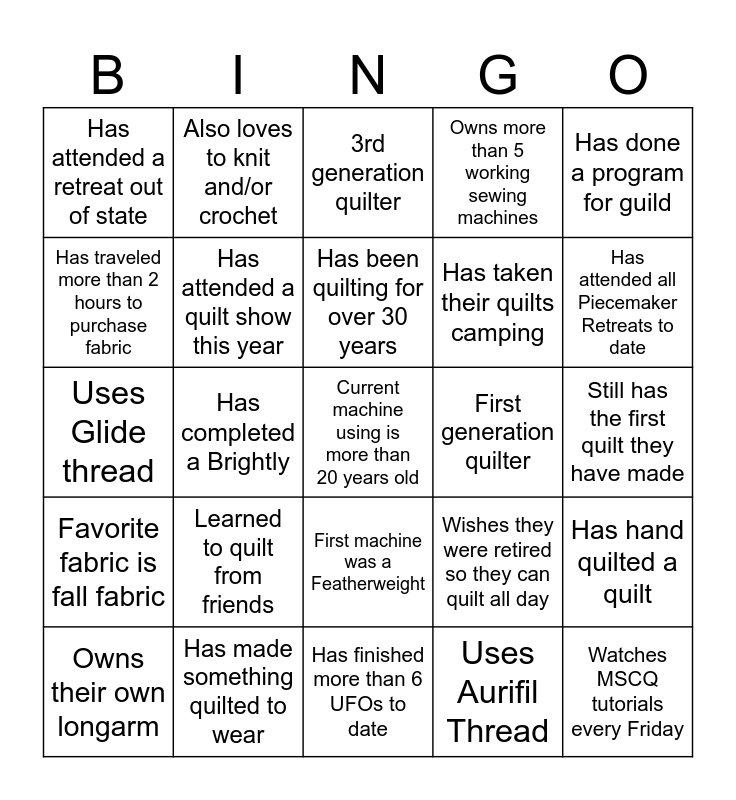 This bingo card has a free space and 39 words: Has visited Missouri star, Has visited Paducah, Has fabric stored in at least 2 rooms in your house, Has attended a quilt show this year, Owns their own longarm, First machine was a Featherweight, Has been quilting for over 30 years, Has been quilting for less than 5 years, Has done a program for guild, Favorite fabric is fall fabric, Has completed a Brightly, Owns more than 5 working sewing machines, Watches MSCQ tutorials every Friday, Still has the first quilt they have made, First generation quilter, Learned to quilt from friends, Uses Gutermann Thread, Has attended a retreat out of state, Has won a ribbon in a quilt show, Wishes they were retired so they can quilt all day, Has traveled more than 2 hours to purchase fabric, Has finished more than 6 UFOs to date, Has taken their quilts camping, Has attended all Piecemaker Retreats to date, Goes to a fabric store at least 2 times a month, Has worked in a fabric store, Has taught someone how to quilt, Receives at least 2 quilting related emails daily, Has never made a t-shirt quilt, Also loves to knit and/or crochet, Has at least 5 tops finished but not quilted, Has bought fabric in person outside of the USA, 3rd generation quilter, Has made something quilted to wear, Uses Aurifil Thread, Loves to applique, Has hand quilted a quilt, Uses Glide thread and Loves to paper piece.