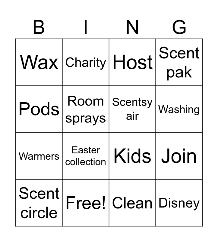This bingo card has 16 words: Free!, Join, Host, Wax, Warmers, Charity, Kids, Clean, Pods, Room sprays, Scent circle, Scent pak, Easter collection, Washing, Scentsy air and Disney.