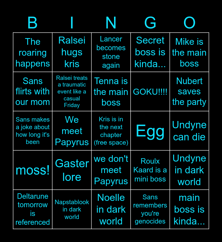 This bingo card has a free space and 24 words: Deltarune tomorrow is referenced, Gaster lore, Tenna is the main boss, Sans remembers you're genocides, Mike is the main boss, The roaring happens, Ralsei hugs kris, Lancer becomes stone again, Egg, Undyne can die, Sans makes a joke about how long it's been, Ralsei treats a traumatic event like a casual Friday, Roulx Kaard is a mini boss, Undyne in dark world, Sans flirts with our mom, Napstablook in dark world, Noelle in dark world, Secret boss is kinda..., Nubert saves the party, moss!, We meet Papyrus, we don't meet Papyrus, GOKU!!!! and main boss is kinda....