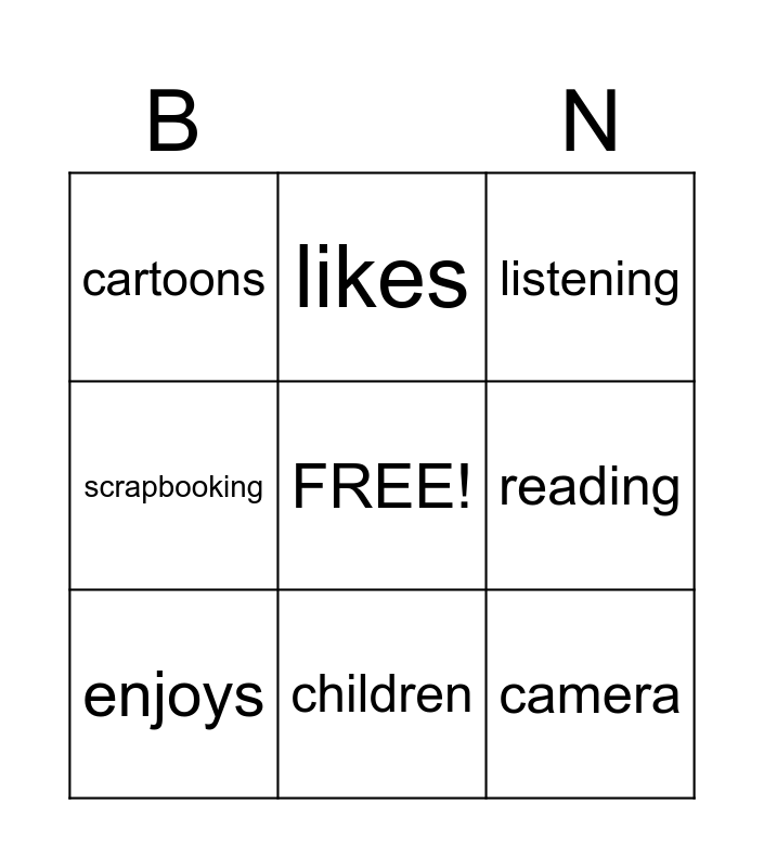 This bingo card has a free space and 24 words: hobby, teaching, children, photography, camera, cartoons, reading, likes, baking, favorite, love, painting, swimming, playing, enjoys, music, cycling, listening, videogames, camping, hiking, cooking, scrapbooking and gardening.
