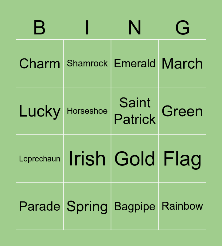This bingo card has 16 words: Spring, Flag, Emerald, Charm, Leprechaun, Shamrock, Gold, Bagpipe, Lucky, Horseshoe, Parade, March, Irish, Green, Saint Patrick and Rainbow.