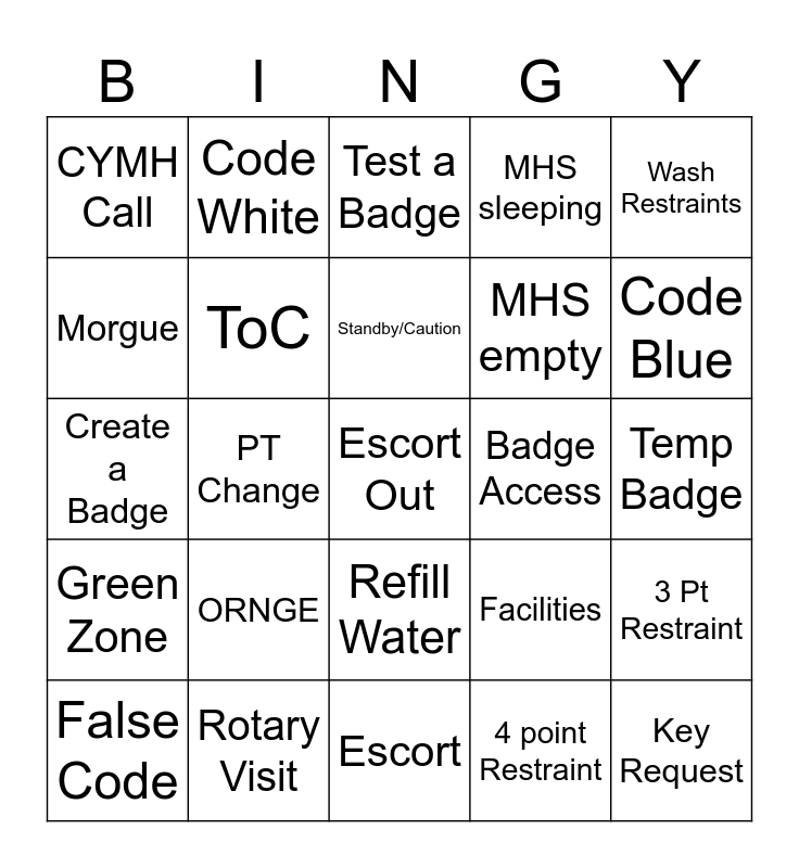 This bingo card has a free space and 24 words: ORNGE, Rotary Visit, Standby/Caution, False Code, Wash Restraints, CYMH Call, Morgue, Code White, Badge Access, Refill Water, MHS empty, Create a Badge, Facilities, 3 Pt Restraint, ToC, 4 point Restraint, Temp Badge, Test a Badge, Code Blue, PT Change, Key Request, Green Zone, MHS sleeping and Escort.