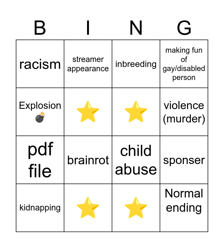 This bingo card has 16 words: ⭐️, sponser, inbreeding, racism, pdf file, streamer appearance, child abuse, ⭐️, Explosion 💣, ⭐️, kidnapping, making fun of gay/disabled person, brainrot, violence (murder), ⭐️ and Normal ending.