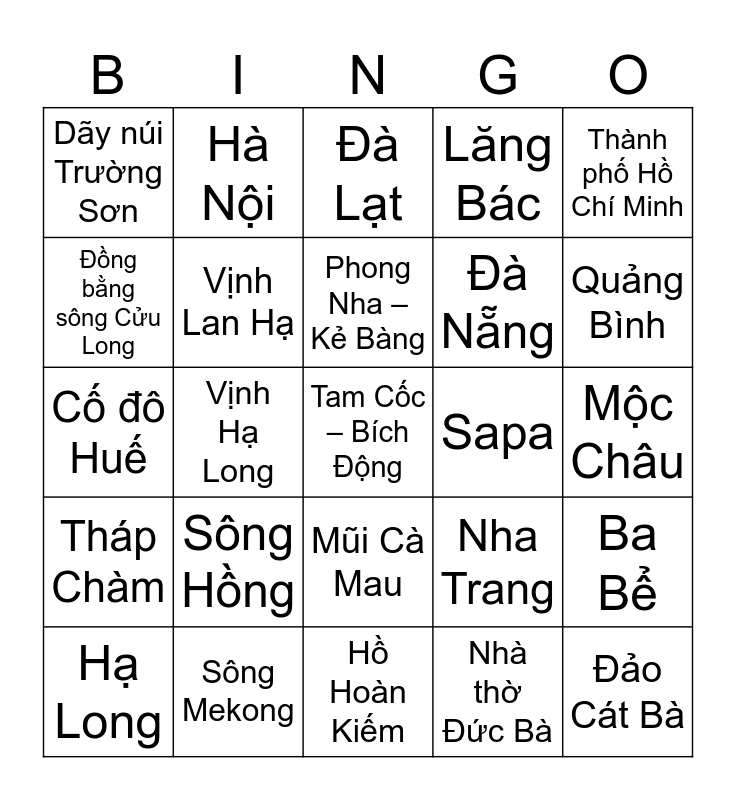 This bingo card has 25 words: Sông Hồng, Hồ Hoàn Kiếm, Phong Nha – Kẻ Bàng, Hạ Long, Thành phố Hồ Chí Minh, Dãy núi Trường Sơn, Đồng bằng sông Cửu Long, Hà Nội, Sapa, Mũi Cà Mau, Đà Nẵng, Cố đô Huế, Nha Trang, Ba Bể, Vịnh Lan Hạ, Đảo Cát Bà, Mộc Châu, Đà Lạt, Quảng Bình, Vịnh Hạ Long, Tam Cốc – Bích Động, Sông Mekong, Tháp Chàm, Lăng Bác and Nhà thờ Đức Bà.
