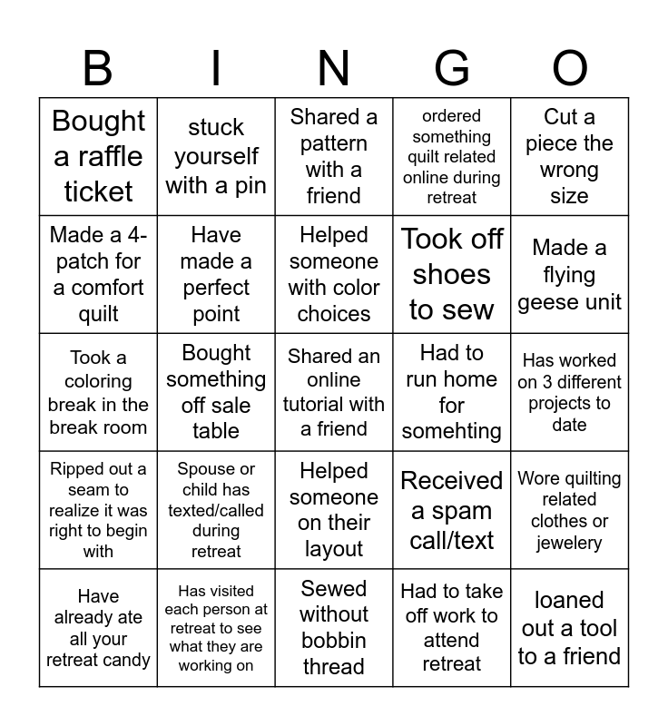 This bingo card has a free space and 39 words: Completed one project so far, Using Christmas fabric, Pattern uses 1/2 square triangles, Have made a perfect point, Have already ate all your retreat candy, Helped someone on their layout, Helped someone with color choices, Has used your seam ripper more than 2 times so far, Cut a piece the wrong size, Ripped out a seam to realize it was right to begin with, Bought something off sale table, ordered something quilt related online during retreat, loaned out a tool to a friend, Has worked on 3 different projects to date, Had to run home for somehting, Spouse or child has texted/called during retreat, Lost your tools right next to your machine, Bought a raffle ticket, Brought a snack to share, Received a spam call/text, Made a 4-patch for a comfort quilt, Sewed without bobbin thread, Took off shoes to sew, Made a flying geese unit, Using precuts in current project, Current project is made from stash, Bought all new fabric for retreat, Fabrics have blue in them, Fabrics have orange in them, stuck yourself with a pin, Learned a new fact about your neighbor, Has talked more than worked, Shared a pattern with a friend, Has visited each person at retreat to see what they are working on, Had to take off work to attend retreat, Learned something new about quilting techniques, Wore quilting related clothes or jewelery, Took a coloring break in the break room and Watched the block demonstration.