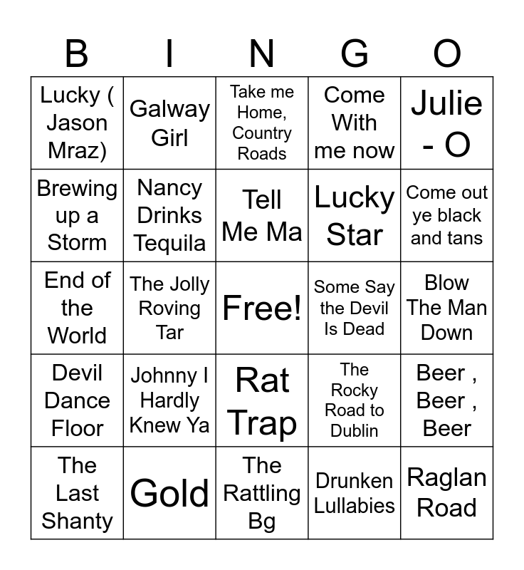 This bingo card has a free space and 53 words: i’m shipping up to boston, Raglan Road, Rattlin’ bog, Drunken Lullabies, Johnny I Hardly Knew Ya, Whisky in the Jar, Galway Girl, The Dublin Pub Crawl, Brewing up a Storm, Come on Eileen, Nancy Drinks Tequila, Whiskey-Bailey’s Guinness, Beer , Beer , Beer, The Rocky Road to Dublin, N17, The Last Shanty, Tell Me Ma, Some Say the Devil Is Dead, The Night Pat Murphy Died, Julie - O, The Jolly Roving Tar, Lucky ( Britney Spears), Lucky Star, Lucky ( Jason Mraz), Lucky B A Lady, Gold, Irish Jig, C’est La Vie, Down Under, Come out ye black and tans, I don’t Care, Shivers, Geno, Captain Kelly Kitchen, Baby I’m Burnin, Pretty Fly ( For a White Guy), Come With me now, The Rattling Bg, Take me Home, Country Roads, HHills of Connemara, Youll Never Beat th irish, The Islander, Blow The Man Down, It’s Friday, Arrive on St. patrick’s Day, Rat Trap, I still haven’t heard what i’m looking for, Johnny Got A Boom Boom, End of the World, Devil Dance Floor, The Devil went down to Georgia, Star of the country down and Western Isles.