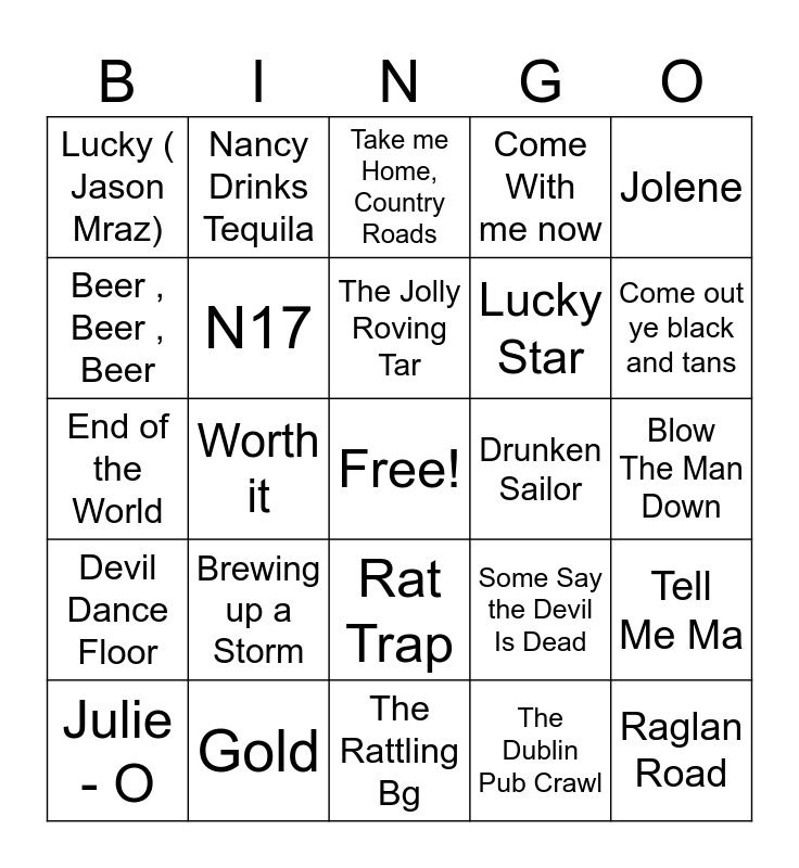This bingo card has a free space and 53 words: i’m shipping up to boston, Raglan Road, Galway Girl, The Dublin Pub Crawl, Brewing up a Storm, Come on Eileen, Nancy Drinks Tequila, Whiskey-Bailey’s Guinness, Beer , Beer , Beer, The Rocky Road to Dublin, N17, The Last Shanty, Tell Me Ma, Some Say the Devil Is Dead, The Night Pat Murphy Died, Julie - O, The Jolly Roving Tar, Drunken Sailor, The Jolly Tinker, Jolene, Worth it, Lucky ( Britney Spears), Lucky Star, Lucky ( Jason Mraz), Lucky B A Lady, Gold, Irish Jig, C’est La Vie, Down Under, Come out ye black and tans, I don’t Care, Shivers, Geno, Captain Kelly Kitchen, Baby I’m Burnin, Pretty Fly ( For a White Guy), Come With me now, The Rattling Bg, Take me Home, Country Roads, HHills of Connemara, Youll Never Beat th irish, The Islander, Blow The Man Down, It’s Friday, Arrive on St. patrick’s Day, Rat Trap, I still haven’t heard what i’m looking for, Johnny Got A Boom Boom, End of the World, Devil Dance Floor, The Devil went down to Georgia, Star of the country down and Western Isles.