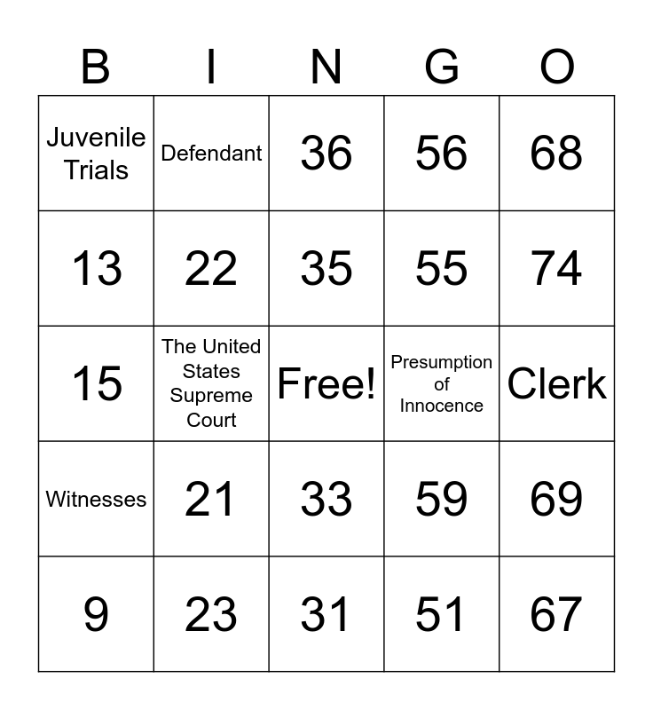 This bingo card has a free space and 102 words: 1, 16, 31, 46, 61, 2, 17, 32, 47, 62, 3, 18, 48, 63, 4, 19, 33, 49, 64, 5, 20, 34, 50, 65, 6, 21, 35, 51, 66, 7, 22, 36, 52, 67, 8, 23, 37, 53, 68, 9, 24, 38, 54, 69, 10, 25, 39, 55, 70, 11, 26, 40, 56, 71, 12, 27, 41, 57, 72, 13, 28, 42, 58, 73, 14, 29, 43, 59, 74, 15, 30, 44, 60, 75, 45, Judge, The United States Supreme Court, Direct Examination, Defense Attorney, Jury Instructions, Re-direct and re-cross, Jury Selection, Hearsay, Presumption of Innocence, Appeals, Juvenile Trials, Verdict, Jury Deliberations, Beyond a Reasonable Doubt, Closing Arguments, Opening Statement, Jury, Oath, Cross Examination, Burden of proof, Witnesses, Defendant, Evidentiary Motions, Exhibit, Clerk, Bailiff and Court Reporter.