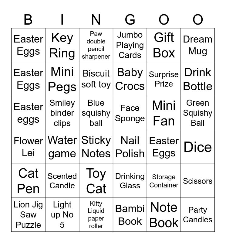 This bingo card has 36 words: Drinking Glass, Toy Cat, Bambi Book, Easter Eggs, Flower Lei, Face Sponge, Mini Pegs, Kitty Liquid paper roller, Gift Box, Storage Container, Drink Bottle, Jumbo Playing Cards, Scissors, Smiley binder clips, Baby Crocs, Easter Eggs, Cat Pen, Mini Fan, Easter eggs, Paw double pencil sharpener, Blue squishy ball, Water game, Nail Polish, Sticky Notes, Easter Eggs, Key Ring, Surprise Prize, Light up No 5, Biscuit soft toy, Dream Mug, Party Candles, Lion Jig Saw Puzzle, Dice, Green Squishy Ball, Scented Candle and Note Book.