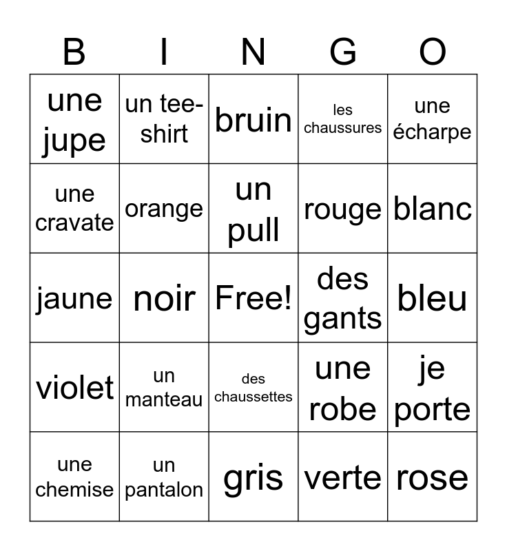 This bingo card has a free space and 24 words: un manteau, un pantalon, un pull, une chemise, une écharpe, une jupe, une cravate, un tee-shirt, des gants, des chaussettes, rouge, jaune, une robe, je porte, orange, verte, bleu, bruin, blanc, noir, rose, violet, les chaussures and gris.