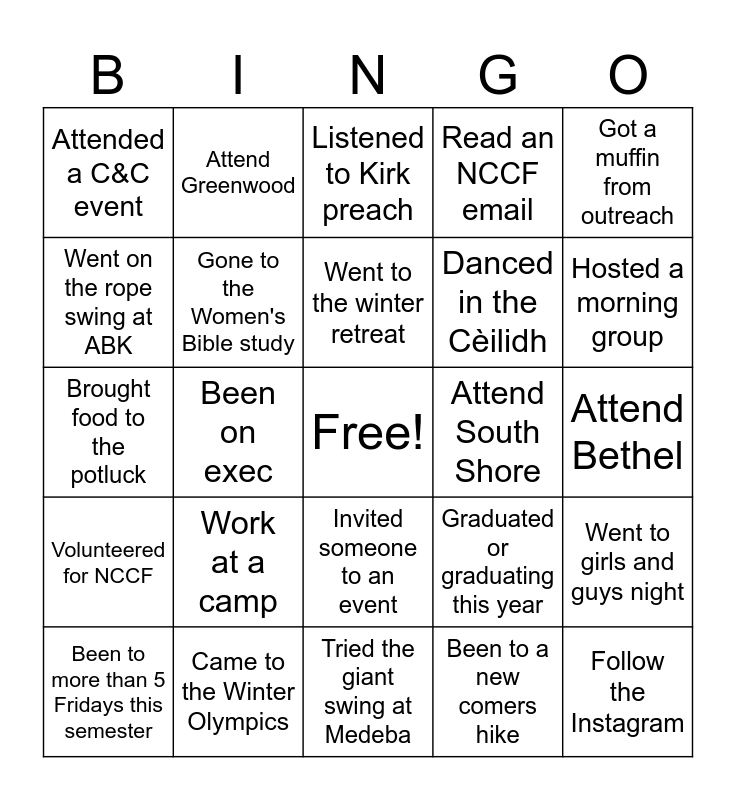 This bingo card has a free space and 39 words: Gone to the Jarvis for a campfire, Gone to morning group, Gone to the men's Bible study, Gone to the Women's Bible study, Been to more than 5 Fridays this semester, Invited someone to an event, Went to the winter retreat, Went to the spring retreat, Got a muffin from outreach, Volunteered for NCCF, Been on exec, Read an NCCF email, Follow the Instagram, Attend Bethel, Attend South Shore, Work at a camp, Participated on the worship team, Attended a C&C event, Went to LCF in Sudbury, Graduated or graduating this year, Went on the rope swing at ABK, Tried the giant swing at Medeba, Danced in the Cèilidh, Hosted a morning group, Just went to formal, Read the bible today outside of church, Signed up for women's Bible study email, Signed up for men's Bible study email, Attend Lakeshore, Attend Greenwood, Attend any church not listed, Pulled an all nighter at retreat, Listened to Kirk preach, Came to the Winter Olympics, Been to a new comers hike, Won the cook off, Went to girls and guys night, Brought food to the potluck and Wrote an encouragement note at retreat.