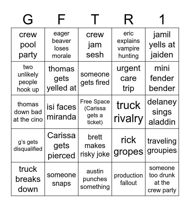 This bingo card has a free space and 24 words: Carissa gets pierced, someone snaps, someone gets fired, truck breaks down, jamil yells at jaiden, crew pool party, two unlikely people hook up, eager beaver loses morale, truck rivalry, brett makes risky joke, urgent care trip, thomas down bad at the cino, rick gropes, traveling groupies, thomas gets yelled at, production fallout, delaney sings aladdin, crew jam sesh, mini fender bender, isi faces miranda, someone too drunk at the crew party, g’s gets disqualified, eric explains vampire hunting and austin punches something.
