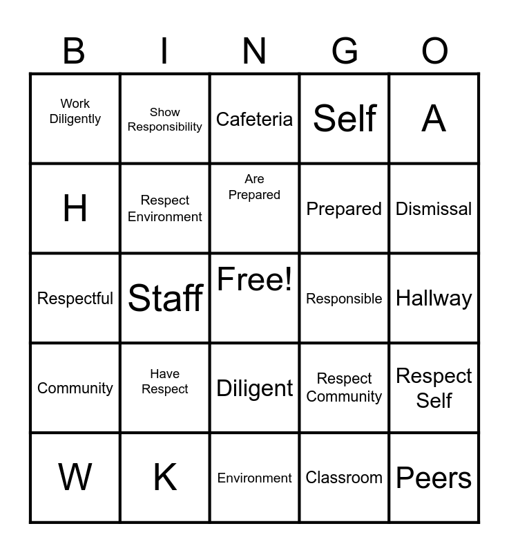 This bingo card has a free space and 24 words: Have Respect, K, Are Prepared, W, A, Work Diligently, H, Show Responsibility, Responsible, Diligent, Prepared, Respectful, Respect Community, Respect Self, Respect Environment, Classroom, Hallway, Cafeteria, Dismissal, Staff, Peers, Community, Self and Environment.