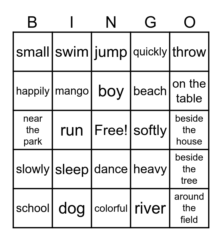 This bingo card has a free space and 29 words: school, climb, run, teacher, small, jump, mango, sleep, softly, dog, beside the house, around the field, colorful, river, on the table, loudly, dance, slowly, throw, near the park, heavy, bright, beach, happily, quickly, swim, beside the tree, boy and big.