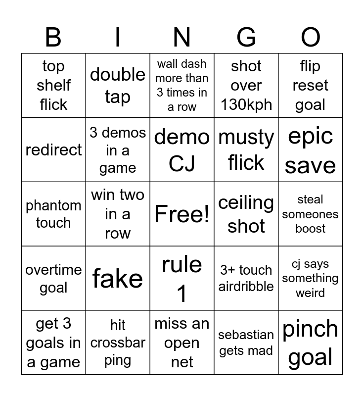This bingo card has a free space and 24 words: fake, hit crossbar ping, demo CJ, get 3 goals in a game, flip reset goal, top shelf flick, redirect, double tap, ceiling shot, rule 1, musty flick, phantom touch, 3+ touch airdribble, cj says something weird, 3 demos in a game, sebastian gets mad, steal someones boost, wall dash more than 3 times in a row, epic save, win two in a row, pinch goal, overtime goal, shot over 130kph and miss an open net.