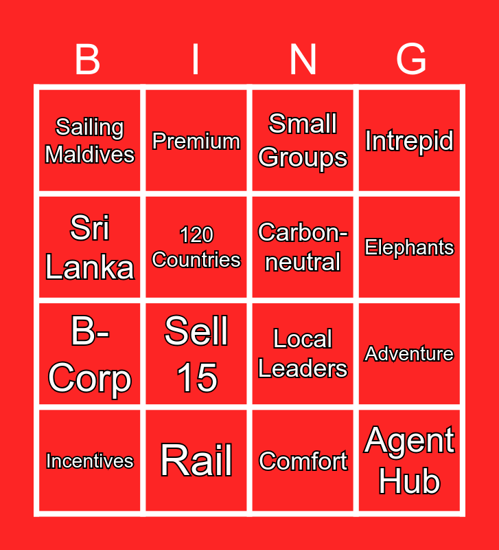 This bingo card has 16 words: Rail, Adventure, Small Groups, Sailing Maldives, B-Corp, Premium, Local Leaders, Comfort, Sri Lanka, 120 Countries, Incentives, Intrepid, Sell 15, Elephants, Carbon-neutral and Agent Hub.